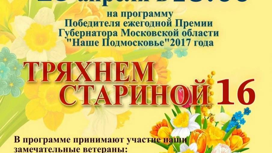 Проекта "Тряхнем стариной" 16 лет.Первая программа была показана в 2010 году.Участники программ Проекта жители Рузского м.о. 55+, которым интересно любое творчество.Самыми первыми участниками были творчесике коллективы ЦКиИ г.Рузы:танцевальный коллектив "Рэтро"(руководитель Екатерина Кузнецова) и хор "Соловейка"(руководитель Алла Федотова).Эти коллективы до сих пор радуют зрителей Проекта своим творчеством и новыми номера.Приглашаем присоединиться к Проекту и поделиться своим творчеством и Вас!