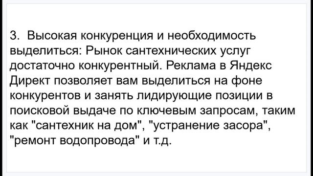 Настройка рекламы Яндекс Директ для сантехнических услуг. Привлечение клиентов на ремонт, установку и обслуживание сантехники. #яндексдирект #контекстнаяреклама #сантехник #сантехническиеуслуги #ремонтсантехники #установкасантехники #вызовсантехника #сантехника #водопровод #отопление #поисковаяреклама #таргетинг #привлечениеклиентов #интернетмаркетинг #мастернадом #аварийныйсантехник #утечкаводы Настройка рекламы Яндекс Директ на поиске в сфере сантехнических услуг – это критически важный инструмент для привлечения клиентов и обеспечения стабильного потока заказов, особенно учитывая экстренный характер многих сантехнических проблем. Вот почему это необходимо: 1. Срочность запросов и необходимость быстрого реагирования: Сантехнические проблемы часто возникают неожиданно и требуют немедленного решения (протечки, засоры, поломки). Реклама в Яндекс Директ позволяет вам оперативно реагировать на эти запросы и предлагать свои услуги в тот момент, когда клиент находится в состоянии острой необходимости. 2. Локальный поиск и геолокация: Клиенты обычно ищут сантехника рядом с собой, чтобы быстро решить проблему. Яндекс Директ позволяет настроить рекламу на определенный географический район, показывая ваши объявления только тем пользователям, которые находятся в зоне вашей досягаемости. 3. Высокая конкуренция и необходимость выделиться: Рынок сантехнических услуг достаточно конкурентный. Реклама в Яндекс Директ позволяет вам выделиться на фоне конкурентов и занять лидирующие позиции в поисковой выдаче по ключевым запросам, таким как "сантехник на дом", "устранение засора", "ремонт водопровода" и т.д. 4. Привлечение клиентов на широкий спектр услуг: Сантехники предлагают широкий спектр услуг, включая ремонт, установку, обслуживание и аварийный вызов. Реклама в Яндекс Директ позволяет вам продвигать все эти услуги и привлекать клиентов на различные типы работ. 5. Возможность круглосуточного привлечения клиентов: Многие сантехнические проблемы возникают в нерабочее время. Реклама в Яндекс Директ позволяет вам привлекать клиентов круглосуточно, обеспечивая постоянный поток заказов. 6. Отслеживание эффективности и оптимизация: Яндекс Директ предоставляет подробную статистику по всем показателям вашей рекламной кампании, что позволяет вам отслеживать эффективность рекламы и вносить необходимые корректировки для улучшения результатов. Вы можете анализировать, какие ключевые слова приносят больше всего клиентов, какие объявления работают лучше всего и какие настройки таргетинга наиболее эффективны. 7. Увеличение узнаваемости бренда и формирование лояльности: Даже если пользователи не кликнут по вашей рекламе, они увидят название вашей компании и запомнят его. Это способствует увеличению узнаваемости бренда и формированию лояльности клиентов, которые в будущем могут обратиться к вам снова. https://kwork.ru/context/35397428/nastroyka-reklamy-yandeks-direkt-poisk-v-sfere-santekhnicheskie-uslugi
