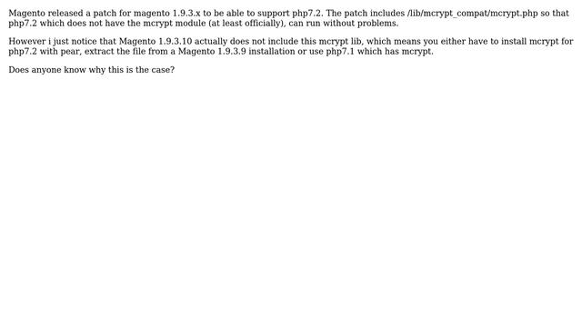 Magento: Why does Magento 1.9.3.10 does not include /lib/mcrypt_compat/mcrypt.php? Helpful? Please support me on Patreon: https://www.patreon.com/roelvandepaar With thanks & praise to God, and with thanks to the many people who have made this project possible! | Content (except music & images) licensed under CC BY-SA https://meta.stackexchange.com/help/licensing | Music: https://www.bensound.com/licensing | Images: https://stocksnap.io/license & others | With thanks to user themew (magento.stackexchange.com/users/56995), user Murtuza Zabuawala (magento.stackexchange.com/users/29731), user dhojgaard (magento.stackexchange.com/users/58781), and the Stack Exchange Network (magento.stackexchange.com/questions/249406). Trademarks are property of their respective owners. Disclaimer: All information is provided "AS IS" without warranty of any kind. You are responsible for your own actions. Please contact me if anything is amiss at Roel D.OT VandePaar A.T gmail.com