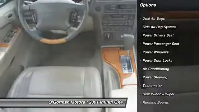 2001 Infiniti QX4 http://www.autoshopper.com/used-trucks/2001_Infiniti_QX4_Irvington_NJ-40296033.htm For more information on this vehicle and our full inventory, please click the link above. This vehicle is located at: O'Gorman Motors 983 Chancellor Avenue Irvington NJ 07111