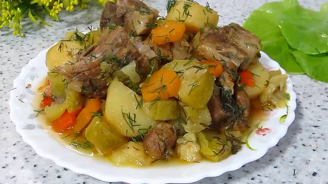 Часто ломаю голову, что приготовить на ужин? Предлагаю один из вариантов ужина, когда просто нет времени на готовку. Очень удобное (и вкусное) блюдо - нарезал, сложил и всё. Овощи дают сок и получается не только вкусно, но и полезно. Готовьте, вам понравится! Ингредиенты: Мясо - 600 - 700 гр Помидоры - 3 шт (если кислых сортов + 1,5 ч.л сахара) Перец сладкий - 2 шт Лук - 3 шт ( средние) Морковь - 1 шт Картофель - 8 шт( средние) Кабачки - 2 шт (средние) Чеснок - 3 зубчика Зелень - укроп, зелёный лук Соль по вкусу Перец молотый Масло растительное - 3 ст.л Вода - 50 мл