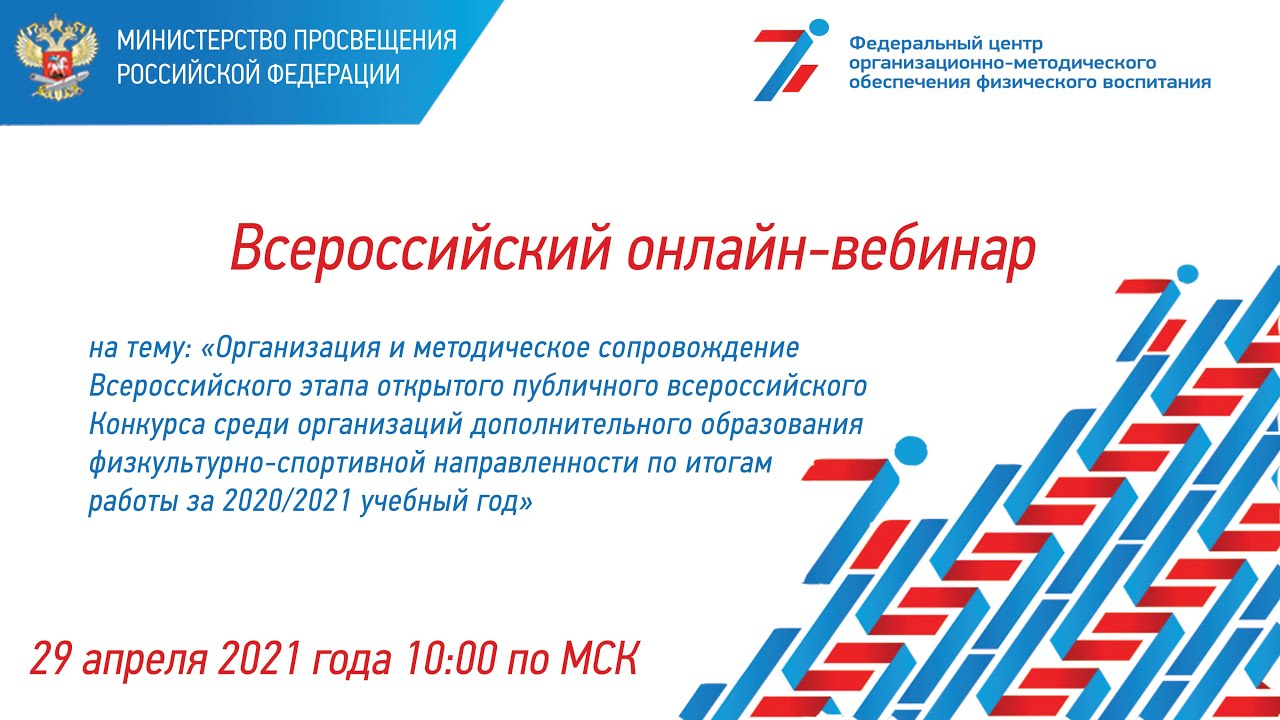 29 апреля 2021 года в 10:00 по московскому времени ФГБУ "ФЦОМОФВ" проведен вебинар для представителей органов исполнительной власти субъектов Российской Федерации, осуществляющих управление в сфере образования, должностных лиц, ответственных за проведение открытого публичного всероссийского Конкурса среди организаций дополнительного образования физкультурно-спортивной направленности по итогам работы за 2020/2021 учебный год на тему: «Организация и методическое сопровождение Всероссийского этапа открытого публичного всероссийского Конкурса среди организаций дополнительного образования физкультурно-спортивной направленности по итогам работы за 2020/2021 учебный год»
