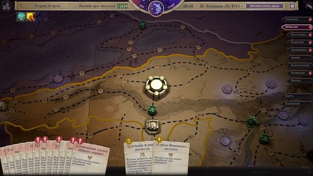 Победил дракона в случайной встрече в путешествии. Отдал големов дварфам и получил материалы взамен. Зачистил Пепельный грот от великанов. Решил из паутины алтаря первого ловчего сделать рубаху. Организовал госпиталь для нищих, больных и юродивых. Начал строительство Зиккурата. Решил не брать в своё войско изгоев, занимающихся запретными науками и магией.