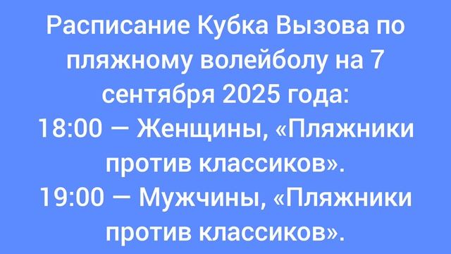 Расписание Кубка Вызова по пляжному волейболу на 7 сентября 2025 года