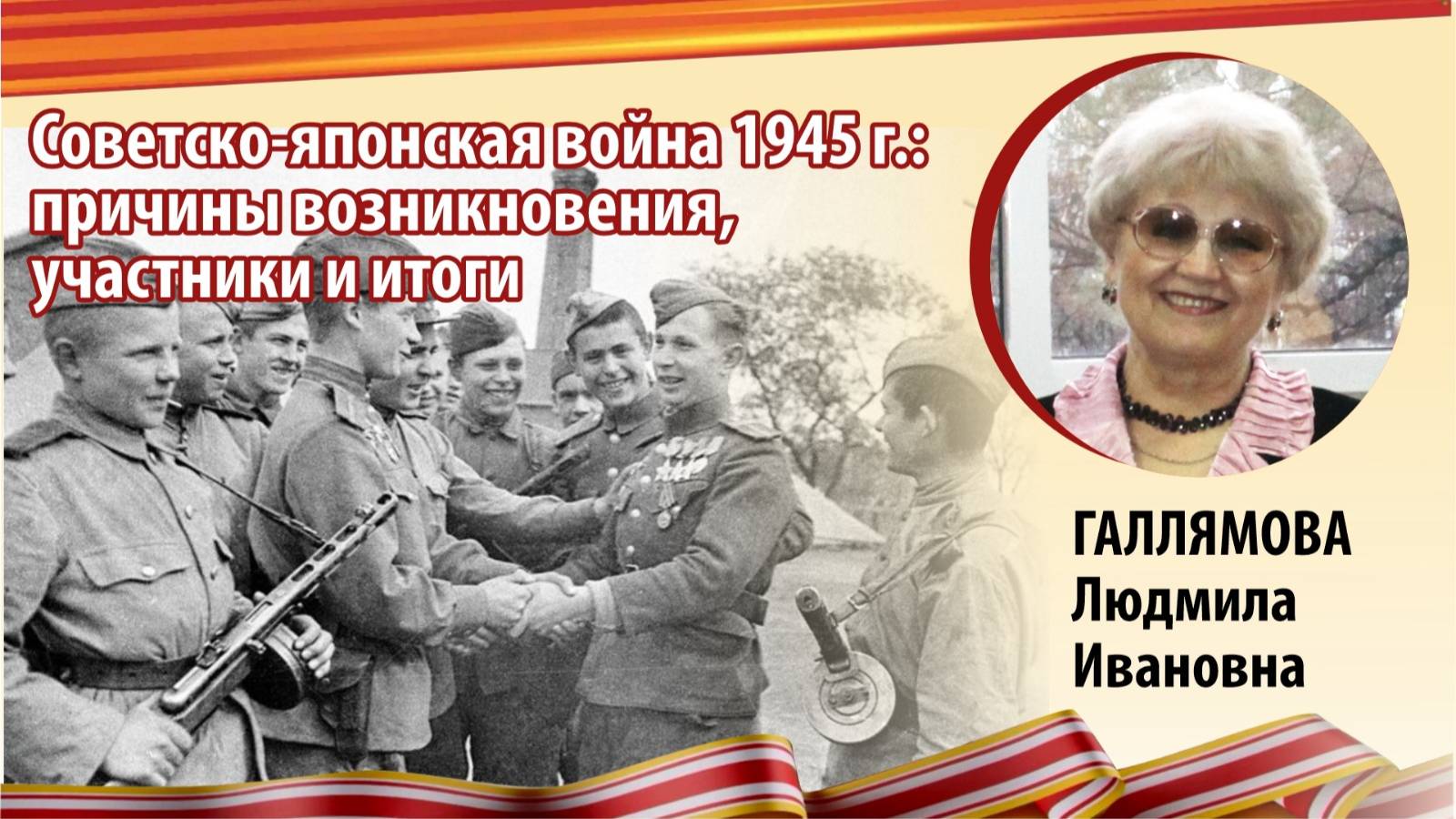 Встреча (лекция) по теме: Советско-японская война 1945 г.: причины возникновения, участники и итоги В гостях у ВПК "Севастополь" Галлямова Людмила Ивановна, Доктор исторических наук, профессор Института истории, археологии и этнографии народов Дальнего Востока Дальневосточного отделения Российской академии наук/