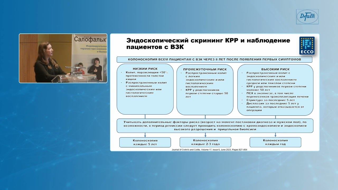 Топчий Татьяна Борисовна, к.м.н., доцент кафедры гастроэнтерологии ФГБУ ДПО «Центральная государственная медицинская академия» УДП РФ, доцент. Лекция посвящена разбору основных положений Консенсуса 2023 г. Европейской организации по изучению болезни Крона и язвенного колита (ECCO) по скринингу злокачественных новообразований у пациентов ВЗК, тактике наблюдения и химиопрофилактике колоректального рака.
