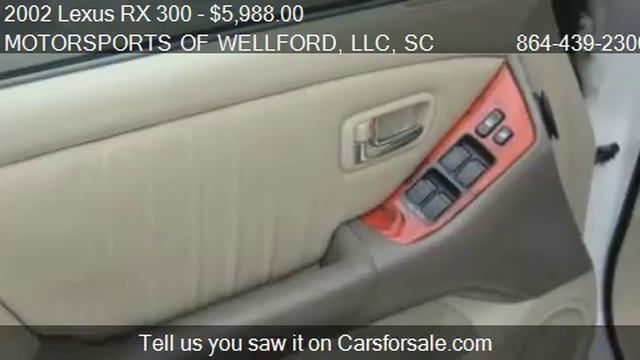 MOTORSPORTS OF WELLFORD, LLC 110 Syphrit Road in Wellford, SC 29385 Come test drive this 2002 Lexus RX 300 2WD for sale in Wellford, SC. http://www.motorsportsautosales.net LOCAL GREENVILLE LEXUS. VERY CLEAN AND WELL MAINTAINED. COME DRIVE TODAY AND ASK ABOUT OUR WARRANTY, FINANCE AND SERVICE PROGRAMS. APPLY ON LINE AT MOTORSPORTSAUTOSALES.NET FOR FAST APPROVAL. WITH FULL TIME JOB AND 1000.00 DOWN YOU MAY ALREADY BE APPROVED WITH US !!!!!!!!!!!!(EVERYONE APPROVED) Option List:ABS Brakes,Air Conditioning,Alloy Wheels,AM/FM Radio,Anti-Brake System: 4-Wheel ABS,Automatic Headlights,Body Style: SPORT UTILITY 4-DR,Cargo Area Cover,Cargo Area Tiedowns,Cargo Volume: 39.80 cu.ft.,Cassette Player,Child Safety Door Locks,Cruise Control,Curb Weight-automatic: 3715 lbs,Daytime Running Lights,Deep Tinted Glass,Driver Airbag,Driver Multi-Adjustable Power Seat,Electronic Brake Assistance,First Aid Kit,Fog Lights,Front Air Dam,Front Brake Type: Disc,Front Headroom: 39.50 in.,Front Hip Room: 55.20 in.,Front Legroom: 40.70 in.,Front Power Lumbar Support,Front Shoulder Room: 57.80 in.,Front Side Airbag,Front Spring Type: Coil,Front Suspension: Ind,Fuel Economy-city: 19 miles/gallon,Fuel Economy-highway: 23 miles/gallon,Full Size Spare Tire,Genuine Wood Trim,Ground Clearance: 7.70 in.,Heated Exterior Mirror,Interval Wipers,Keyless Entry,Leather Steering Wheel,Maximum GVWR: 4950 lbs,Maximum Payload: 1235 lbs,Maximum Towing: 3500 lbs,Overall Height: 65.70 in.,Overall Length: 180.10 in.,Overall Width: 71.50 in.,Passenger Airbag,Passenger Multi-Adjustable Power Seat,Passenger Volume: 100.80 cu.ft.,Power Adjustable Exterior Mirror,Power Door Locks,Power Windows,Rear Brake Type: Disc,Rear Headroom: 39.20 in.,Rear Hip Room: 55.20 in.,Rear Legroom: 36.40 in.,Rear Shoulder Room: 57.00 in.,Rear Spring Type: Coil,Rear Suspension: Ind,Rear Window Defogger,Rear Wiper,Second Row Folding Seat,Splash Guards,Standard GVWR: 4950 lbs,Standard Payload: 1235 lbs,Standard Seating: 5,Standard Towing: 2000 lbs,Steering Type: RandP,Steering Wheel Mounted Controls,Subwoofer,Tachometer,Tank: 19.80 gallon,Tilt Steering,Tilt Steering Column,Tires: 225/70R16,Track Front: 61.60 in.,Track Rear: 61.00 in.,Traction Control,Trip Computer,Turning Diameter: 41.30 in.,Vehicle Anti-Theft,Vehicle Stability Control System,Wheelbase: 103.10 in. Provided by Carsforsale.com http://video.carsforsale.com/vehiclevideo.aspx?vid=208235293