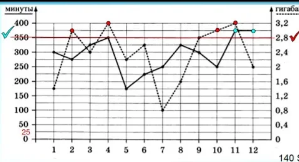 На графике точками изображено количество минут, потраченных на исходящие вызовы, и количество гигабайтов мобильного интернета, израсходованных абонентом в процессе пользования смартфоном, за каждый месяц 2018 года. Для удобства точки, соответствующие минутам и гигабайтам, соединены сплошными и пунктирными линиями соответственно. В течении года абонент пользовался тарифом «Стандартный», абонентская плата по которому составляет 400 руб. в месяц. При условии нахождения абонента на территории РФ в абонентскую плату тарифа «Стандартный» входят: пакет минут, включающий 350 минут исходящих вызовов на номера, зарегистрированные на территории РФ; пакет интернета, включающий 2,8 гигабайта мобильного интернета; пакет SMS, включающий 150 SMS в месяц; безлимитные бесплатные входящие вызовы.
