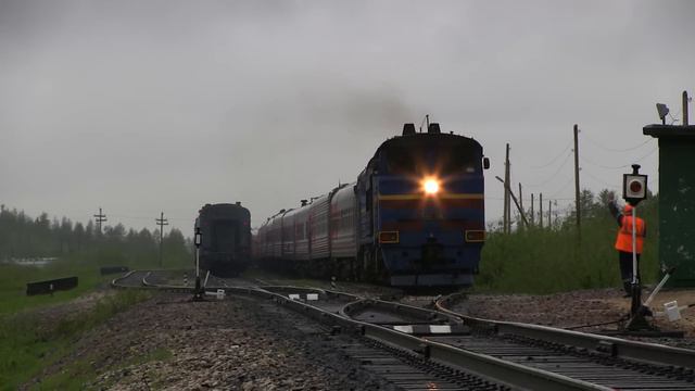 Тепловозы 2ТЭ10Ут-К-0039 и 2ТЭ10Ут-0098 с пассажирскими поездами Лабытнанги - Москва и Москва - Лабытнанги. Станция Собь, Ямало-Ненецкий автономный округ, Россия. 2014. (с) Воздух Свободы. 2TE10UTK-0039 and 2TE10UT-0098 diesel locomotives with passenger trains Labytnangi - Moskow and Moskow - Labytnangi. Sob' station, Yamal-Nenetskiy region, Russia. 2014. FreeAir.