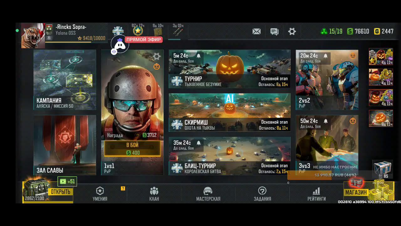 Поддержка автора по ссылке: https://www.donationalerts.com/r/rincks райффазен банк 2200 3005 1695 5281 телеграм группа для подписчиков https://t.me/art_of_war_3_rincks_sopra Продлить стрим:300 руб Смена фракции:200 руб Тренировка:300 руб 2х2: по совести Покажи кач: миллион рублей Закончить стрим:1000 руб Так же можно заказать челлендж. тоесть дать стримеру задание за определенную сумму. Например: сыграть только авиацией или вообще без неё,ну и так далее. Ссылка на игру: Долго искал настоящую стратежку на телефон, как старкрафт. Наконец нашел Art of War 3! Очень крутая игра! Вот ссылка, качай, тебе понравится: https://redirect.appmetrica.yandex.com/serve/169878688668608468?recruiter_id=1111515909