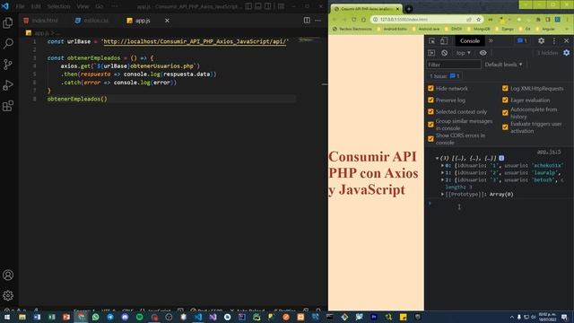 Ejemplo de como consumir una PI con Axios en JavaScript ⚠️ ? CURSO ? ⚠️ Aprende Android con Ejemplos: https://bit.ly/40dIY4m ? ? DISCORD ? ? https://discord.gg/Kdwe37Ng7g ? ? TWITCH ? ? https://www.twitch.tv/dev_xcheko51x ? ? TWITCH ? ? https://www.twitch.tv/xcheko51xtv ? CÓDIGO ? https://github.com/xcheko51x/CRUD-MySQL-PHP-Axios-JavaScript ⚠️ ? Si te sirvió el video puedes apoyarme dando like, suscribiéndote y compartiéndolo. ? ⚠️