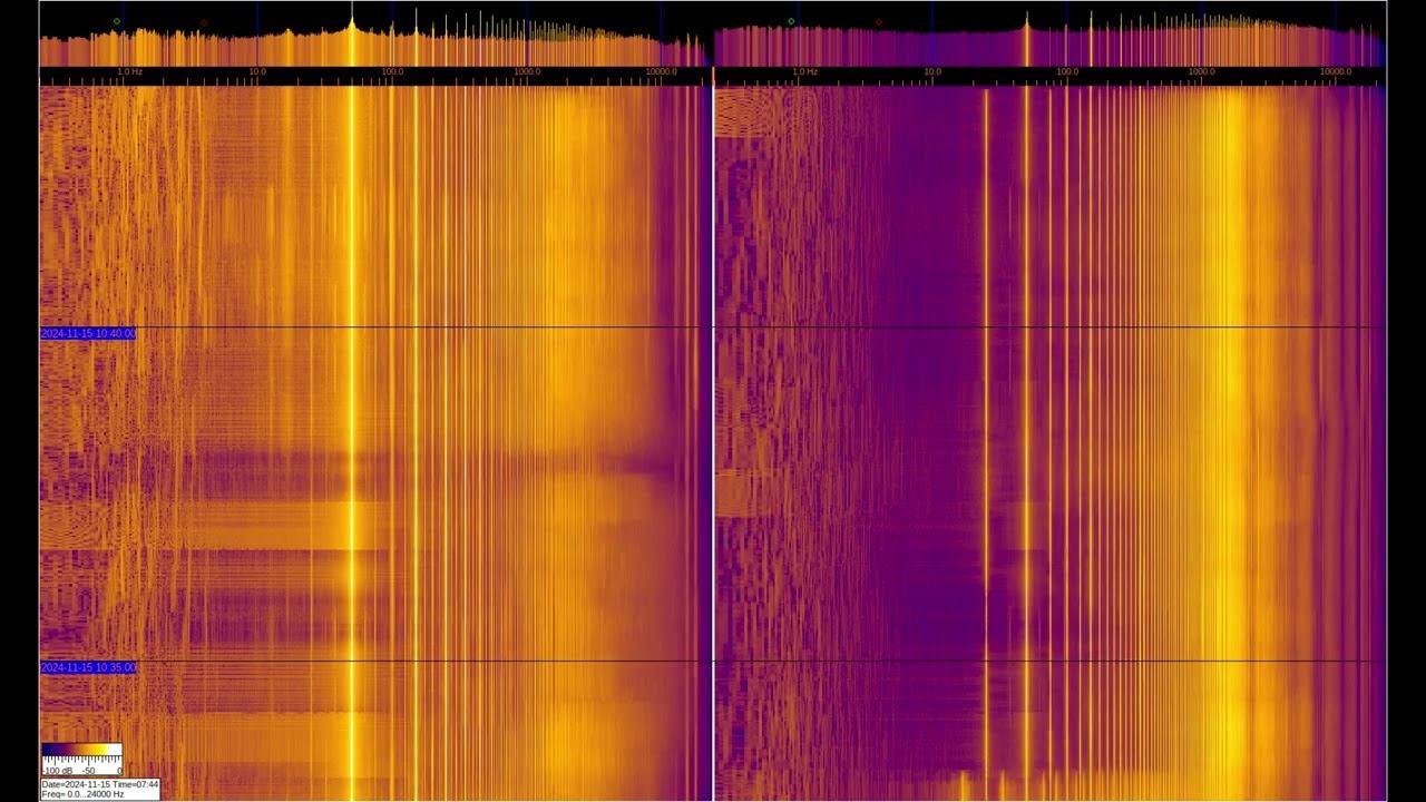 The left and right signals are taken from inductive sensors with ferromagnetic elements, but the left one is additionally connected to grounding on 2 stainless steel pins buried 1 m and spaced 1 m apart. You can see a large number of harmonics from the power supply and various artificial signals. Of interest are signals at frequencies below 50 Hz, where you can observe the operation of specialized equipment and communication signals of submarines and underground objects. Separately, it is worth considering signals in the region of 1-3 Hz on the left spectrum, which relate to the geomagnetic background, which is modulated by solar activity, They can be viewed in more detail in the video called “Signals from the Earth,” which are in the playlists below. The sound in the video is recorded in real time - a signal from sensors. О ПРОИСХОЖДЕНИИ ЧАСТОТНОЙ МОДУЛЯЦИИ СЕРПЕНТИННОЙ ЭМИССИИ https://youtu.be/bwWHggY1IVU?si=xAX1diRKI9MxQJ88&t=1740 Previous monitoring is in playlists: EMF monitor https://youtube.com/playlist?list=PLiRg2YCbXcwn41BHqADKVBep_TgVq6XUN Очень Низкая Частота ~ Very Low Frequency https://youtube.com/playlist?list=PLiRg2YCbXcwnp5DxM4PnSs7k_Rnypaqek SIGNALS IN THE GROUND https://youtube.com/playlist?list=PLiRg2YCbXcwl6f3Bf5arHbGSOCNE5U71O поддержать канал: 8-999-654-93-44