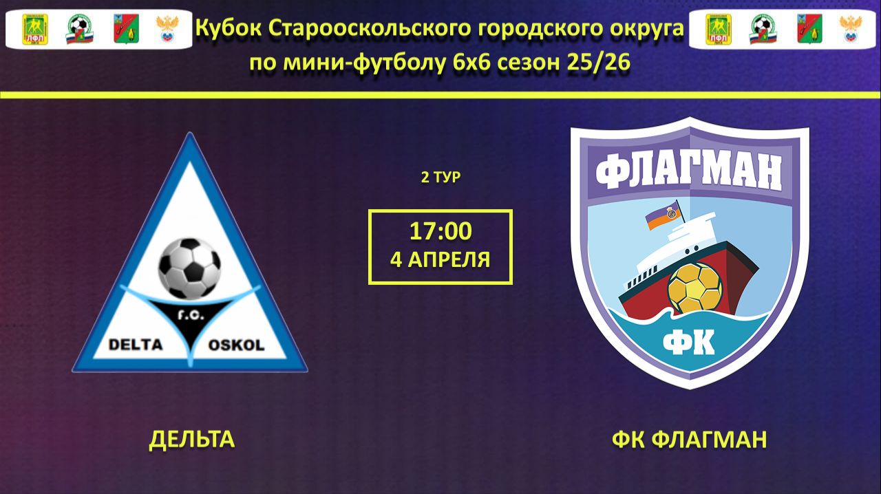 ДЕЛЬТА -- ФК ФЛАГМАН | 2 Тур Кубка Города по мини-футболу 6х6 Группа В | Кубок Города Старый Оскол сезон 2026 в формате 6*6 г. Старый Оскол мкр-н Надежды 14 Арена N1 Поле 1 3 апреля 21:00