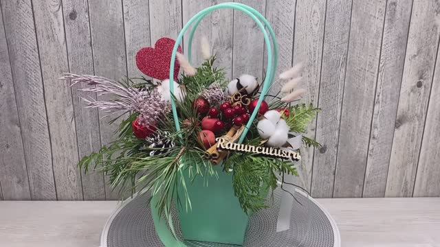 Новогодняя композиция из туи и сосны в сумочке