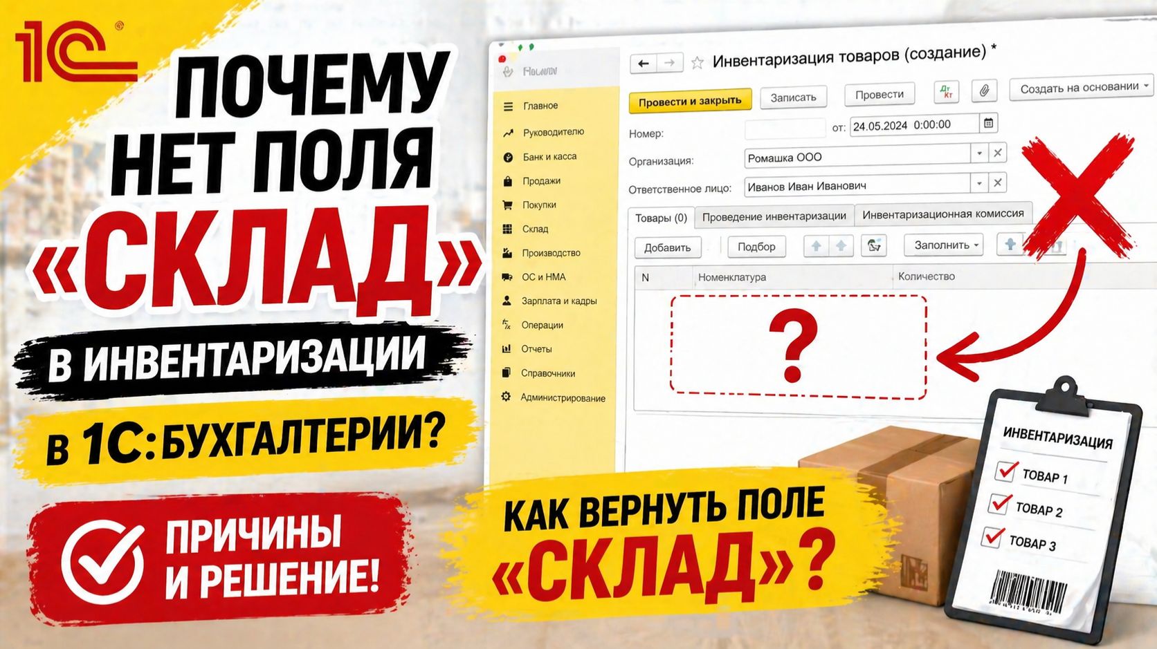 Как вернуть поле «Склад» в инвентаризации в 1С:Бухгалтерии 8