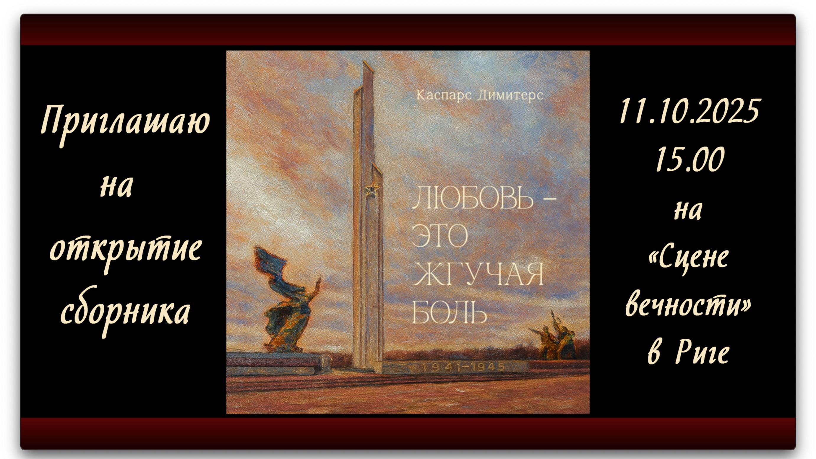 Приглашаю на открытие сборника песен "Любовь – это жгучая боль"/ 11.10.2025 в 15.00, г.Рига, ул. Менесс 3 — Покровское кладбище, памятник "Сцена вечности" на могилке Вии Елизаветы Артмане. KASPARS DIMITERS /010557-10531/ LV63UNLA0001046716777 SWIFT KODS: UNLALV2X https://www.paypal.me/dimiters • • • СБОРНИК ПЕСЕН ИЗ ДЕВЯТИ МОИХ РУССКИХ АЛЬБОМОВ, ПОСВЯЩЁННЫХ ПАВШИМ ЛЮДЯМ И ПАВШЕЙ СТЕЛЕ ПОБЕДЫ В РИГЕ: 1 ОН ШЁЛ ПО МИННОМУ ПОЛЮ 2 ОТ ЯРОСЛАВЛЯ ДО МОЛИТВЫ 3 ПРИНЦЕССЕ ИЛОНЕ ДОНЕЦКОЙ 4 «СУХОЙ» ОН БЫЛ — ПРИШЁЛ СГОРЕТЬ ЗА НАС 5 ПОЗЫВНОЙ «КУБАНЬ» 6 ТЫ ТОЛЬКО ЖДИ МЕНЯ — БУДУ 7 ПЛАЧ ВЕТЕРАНА-ИНВАЛИДА ЗА ПАВШУЮ БАЛЕРИНУ КАТЮ 8 КОТ КОСТЯ И МЫШОНОК ВЕРОНИКА 9 ДАРЬЯ, ДУШЕНЬКА, ДАША 10 БЕЛГОРОД — БЕЛАЯ ТЬМА 11 ЛИСИЧАНСК — ИКОНКА НЕРОЖДЁННОГО РЕБЁНКА 12 ЖИВ ВОЛК — СТИХИ ЕГО ПЛОТЬ 13 ПОД ПАДАЮЩИМИ ЗВЁЗДАМИ ПОБЕДЫ 14 ЖУРАВЛИ • • • Памятник-стелу Победы в Риге торжественно открыли 5 ноября 1985 года. Этому монументу, воздвигнутому в честь победы Красной армии над фашистской Германией, смертный приговор был приведён в исполнение 25 августа 2022 года в 16:42. Казнь памятника стала актом осквернения памяти, в том числе 90 000 убитых евреев Латвии. 5 ноября 2025 года памятник-стела Победы мог бы праздновать своё сорокалетие. • • • Любовь — это жгучая боль. Когда ты весь в чужих ранах и в них соль — Соль твоих невидимых слез С ароматом божественных роз. • • • kaspars@dimiters.ru +371 25451826 Латвия