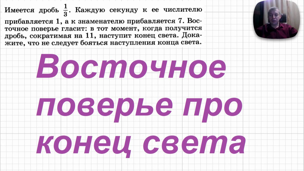 День 20-й. Задача про несократимость дроби на 11. Какое-то восточное поверье про конец света еще приплели. Не боимся. ) Для понимания решения нужны знания 5-6 класса: уметь работать с буквенными выражениями.