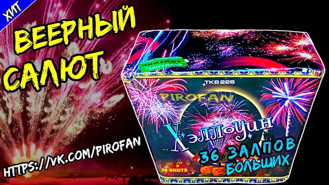 Салют 36 залпов больших, фейерверк "Хэллоин" (Веерный) - Калибр: 25мм = 1" дюйм - Время действия: 15 секунд - Высота выстрела: 25 метров - Гарантия и сертификат от ПироФан