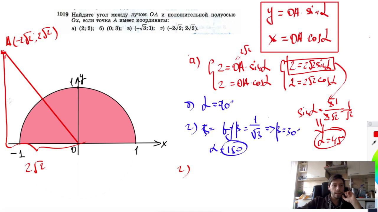 №1019. Найдите угол между лучом ОА и положительной полуосью Ох, если точка А имеет координаты: а) (2; 2); б) (0; 3); в) (- √3; 1); г) (-2√2 ; 2√2). Поддержать канал рублём - 5469400944002125 (Сбербанк) Мой второй канал для подготовки к ЕГЭ и ОГЭ - https://www.youtube.com/ЕвгенийСумин Инстаграм - https://www.instagram.com/EGE_OGE.math Личный инстаграм - https://www.instagram.com/ee_sumin VK - https://vk.com/evgeniysumin FB - https://www.facebook.com/EvgeniySumin