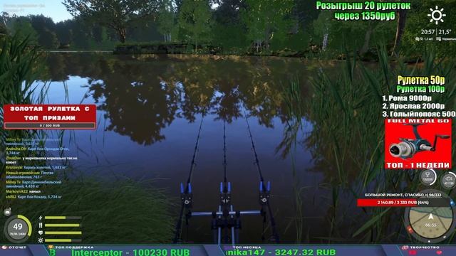 Поддержка донатом https://new.donatepay.ru/@1032463 Альтернативный донат https://www.donationalerts.com/r/kalyamba11 5536913964533059 карта Тинькоф Если стрим лагает,смотри стрим на трово https://trovo.live/s/Kalyamba_na_Ribalke Тг https://t.me/kalyamba_na_ribalke Мой ВК - https://vk.com/kalyantv НИК в игре kalyan11 НАШ ДС https://discord.gg/4ZzSQkQtsK Заказ водоема на 1 час - 500р ( весь стрим 2500р ) Модерка на канале 1300р ( каждая следующая на 100р больше) ✅Призы в рулетке "ЗОЛОТАЯ" 500р ✔ ЗОЛОТО ✔ ПРЕМ ✔ КАТУШКИ РАПТОР 40, ВЕНГИ, ТАЙГА, СИЛЬВЕР 80, И другие ✔ ПАЛКИ ПИЛКЕРНАЯ, ДОНКА МОРСКИЕ, ✔ РОД ПОД, СТУЛЬЯ ✅Призы в рулетке СТАНДАРТ : 100р ✔ катушкИ РАПТОР 40, ВЕНГИ, ТАЙГА, СИЛЬВЕР 80, И другие ✔ катушки 60 для медного ( ЭВИИ, НАТОРЫ, ГОЛДА, и тд) ✔ ПИЛКЕРНОЕ УДИЛИЩЕ КОРОЛЕВА ОКЕАНА ✔ Морское Донное удилище ✔ прем ( 3, 7, 30 дней) ✔ золото ( 1, 3, 5, 10, 20 ,50) ✔ билет на море ( 1, 3, 5 дней) ✔ голд наживка и др. ✅Призы в рулетке "СТАРТОВАЯ" 50р ✔ катушка Венга ✔ катушка "silver80" ✔ катушка "БЕЛЫЙ КАЛИБР" ✔ катушка "Черный калибр" ✔ катушка "Протон" ✔ катушка "Нарга 6000" ✔ Набор Фидерист и спинингист ✔ Карповик Фортуна ✔ фидерные удилища ✔ прем, золото, алкашка, наживки и тд P.s Рулетка это не казино, а награда за поддержку стримера. Вечный ТОП ПОДДЕРЖКИ (10.06.2025) 1. Леха сварной 214 572 2. Dimon_pokemonchik 127 034 3. Skreb79 103 061 4. Interceptor 96 230 5. FishRus86 82 500