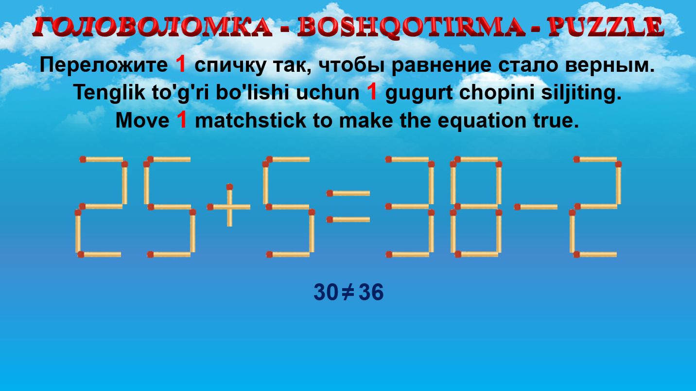 ГОЛОВОЛОМКА - BOSHQOTIRMA – PUZZLE. Спичка. 25+5≠38-2, 28+8≠39-4, 29+6≠38-5, 28+5≠40-5