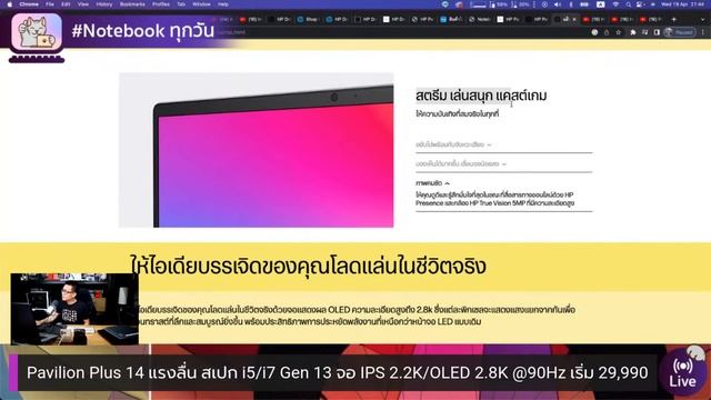 HP Pavilion Plus 14 ทำงาน Creator แรงลื่น สเปก i5/i7 Gen 13 จอ IPS 2.2K/OLED 2.8K @90Hz เว็บแคม 5MP ราคา 29,990 – 39,990 บาท . อ่านเพิ่ม https://www.thaitechbuyerguide.com/hp-pavilion-plus-14-2023-creator-notebook/ . HP Pavilion Plus 14 เป็นโน๊ตบุ๊ครุ่นใหม่ปี 2023 ดีไซน์บางเบาแต่ประสิทธิภาพสูง ได้ทั้งสเปกแรงและหน้าจอที่สวยและดีที่สุด เน้นการทำงานสายสร้างสรรค์ เช่นการทำ Artwork หรือตัดต่อวีดีโอ รวมไปถึงความบันเทิง ให้ประสบการณ์ที่เหนือชั้นกว่า โดยสเปก Intel Core i Gen 13 อาทิ i5-1340P / i5-13500H / i7-13700H ที่เลือกได้ตามความต้องการ ซึ่งนับว่าเป็น Creator Notebook งบ 3x,xxx บาท ที่น่าใจทีเดียวจากแบรนด์ HP . โดย HP Pavilion Plus 14 ได้แรมออนบอร์ด 16GB LPDDR5 และ SSD M.2 NVMe PCIe Gen 4 ที่ 512GB มาพร้อมหน้าจอ OLED ขนาด 14″สัดส่วน 16:10 ความละเอียด 2.8K (2880 x 1800) 90Hz มาตรฐานสีที่ระดับ DCI-P3 100% หรืออีกสเปกจะเป็นพาเนล IPS ที่ 2.2K (2240 x 1400) ที่ค่า sRGB 100% ตอบโจทย์งาน Creator ได้อย่างมืออาชีพ โดดเด่นด้วยความบางเพียง 18.4 มม. ที่น้ำหนัก 1.4 กก พกพาสะดวกแน่นอน . วัสดุตัวเครื่องของ HP Pavilion Plus 14 มีทั้งโลหะและพลาสติกซึ่งผ่านกระบวนการรีไซเคิลมา พร้อมสี Natural Silver ที่โดดเด่นตามสไตล์ HP การเชื่อมต่อไร้สายที่ดีที่สุด Wi-Fi 6E มาพร้อมพอร์ตเชื่อมต่อครบครัน แบตเตอรี่เองก็ใช้ได้ยาวนานสูงสุด 11:30 ชม โดยมีฟีเจอร์ช่วยการทำงานมากมาย เรียกได้ว่าตอบโจทย์การพกพา รองรับการใช้งานรอบด้าน อีกทั้งได้เว็บแคม 5MP ที่คมชัดพร้อมช่วย VDO Call ได้อย่างมืออาชีพกว่า . HP Pavilion Plus 14 ติดตั้งระบบปฏิบัติการเป็น Windows 11 Home มาทันที ได้ Microsoft Office Home and Student 2021 ส่งผลให้มี Word / Excel / Power Point ติดเครื่องไปแบบไม่ต้องซื้อเพิ่ม ซึ่งนับว่าคุ้มค่ามากค้าเทียบกับสเปกและฟีเจอร์ การรับประกัน 2 ปี On-site Service ทั้งหมดนี้เลยทำให้ HP Pavilion Plus 14 เป็นโน้ตบุ๊ตบางเบารุ่นใหม่ในปี 2023 สายแรงลื่นจอสวยที่น่าสนใจ ในราคา 29,990 – 39,990 บาท . HP Pavilion Plus 14-eh1888TU ราคา 29,990 บาท CPU : Intel Core i5-1340P (4 P-core + 8 E-core Up to 4.6GHz) GPU : Intel Iris Xe Graphics RAM : 16GB LPDDR5 Bus 4800MHz DISPLAY: 14″ IPS 2.2K (2240 x 1400px) STORAGE : SSD M.2 NVMe PCIe 512GB OS : Windows 11 Home Software : Office Home & Student 2021 Warranty : 2 Years On-site Service + 1 Year ADP . HP Pavilion Plus 14-eh1013TU ราคา 34,440 บาท กดสั่งซื้อได้เลยที่ https://shope.ee/99scRWhJC7 CPU : Intel Core i5-13500H (12C/16T & 1.9 – 3.5GHz + 2.6 – 4.7 GHz) GPU : Intel Iris Xe Graphics RAM : 16GB LPDDR5 Bus 4800MHz DISPLAY: 14″ IPS 2.2K (2240 x 1400px) STORAGE : SSD M.2 NVMe PCIe 512GB OS : Windows 11 Home Software : Office Home & Student 2021 Warranty : 2 Years On-site Service + 1 Year ADP . HP Pavilion Plus 14 14-eh1012TU ราคา 39,990 บาท CPU : Intel Core i7-13700H (14C/20T & 1.8 – 3.7GHz + 2.4 – 5.0 GHz) GPU : Intel Iris Xe Graphics RAM : 16GB DDR4 Bus 4800MHz DISPLAY: 14″ OLED 2.8K 90Hz STORAGE : SSD M.2 NVMe PCIe 512GB OS : Windows 11 Home Software : Office Home & Student 2021 Warranty : 2 Years On-site Service + 1 Year ADP . #Pavilion2023 #PavilionPlus14 #HP2023 #Notebook2023 #AdminPong #ThaiTechBuyerGuide . ชวนเข้าตี้…แนะนำและช่วยเลือกซื้อ รีวิว Notebook ใหม่ๆ https://www.facebook.com/groups/1218808492224775 . ฝากกดติดตามด้วยนะครับ http://www.thaitechbuyerguide.com/ https://www.youtube.com/c/AdminPong/ https://www.facebook.com/pongthebuyesrguide
