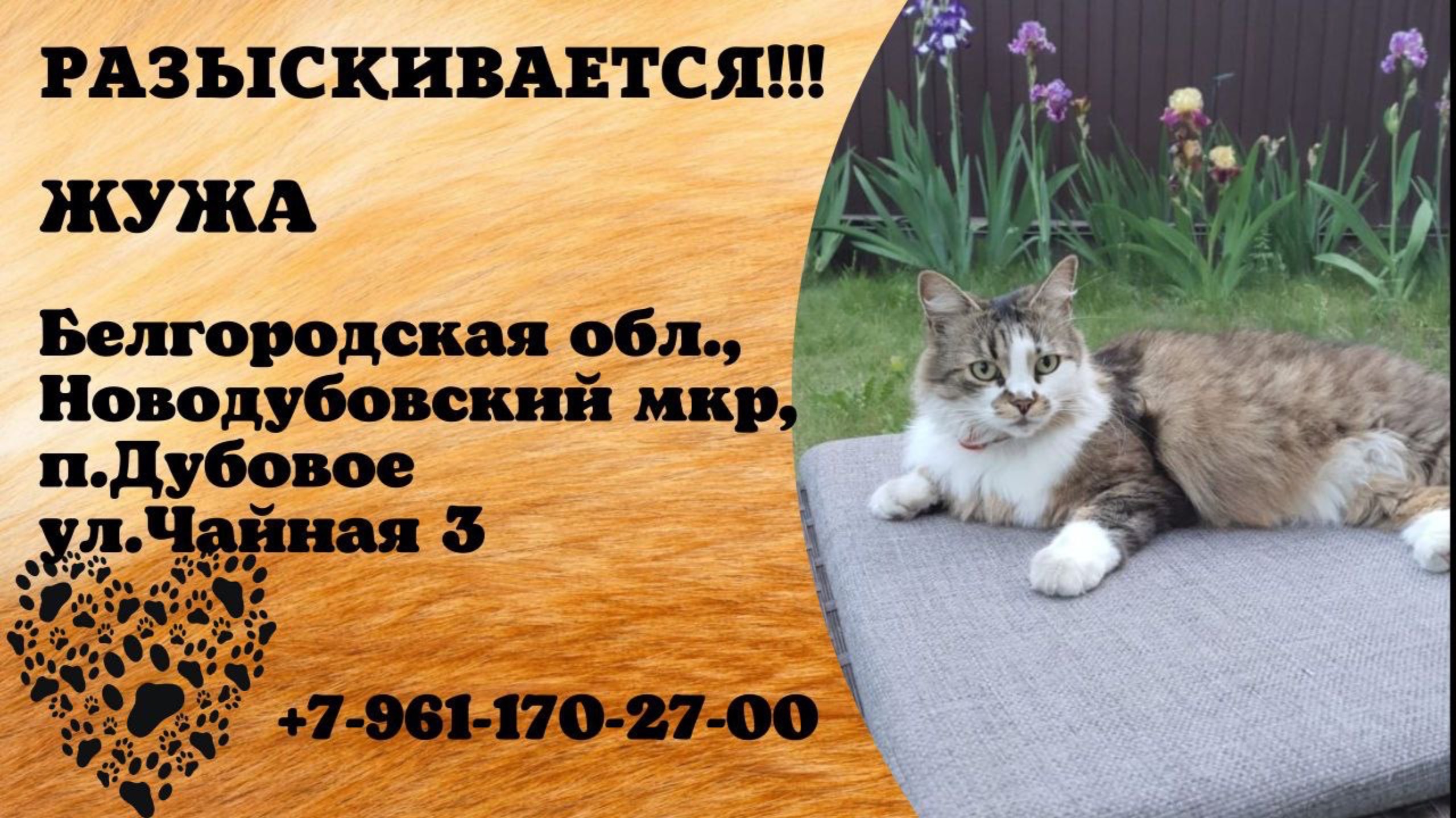 Белгородская Белгород Пропала кошка Помогите вернуть Жужу!!! Ей 4 года, пуглива, 4 кг, очень пушистый хвост и штанишки. Вознаграждение гарантировано!!! Пропала (не убежала) 10 октября (пятница) утром у частного дома в Ново-Дубовском мкр.пос.Дубовое, ул.Чайная 3. Могла быть вывезена и выброшена кем-то из окружения. Любая информация по тлф. 8 961 170 27 00. Жанна Инфо https://vk.com/wall-198815410_212817 Автор https://vk.com/id722159590 #пропала_кошка#белгород