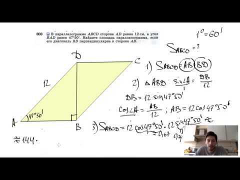 №603. В параллелограмме ABCD сторона AD равна 12 см, а угол BAD равен 47°50'. Найдите площадь параллелограмма, если его диагональ BD перпендикулярна к стороне АВ. Поддержать канал рублём - 5469400944002125 (Сбербанк) Мой второй канал для подготовки к ЕГЭ и ОГЭ - https://www.youtube.com/ЕвгенийСумин Инстаграм - https://www.instagram.com/EGE_OGE.math Личный инстаграм - https://www.instagram.com/ee_sumin VK - https://vk.com/evgeniysumin FB - https://www.facebook.com/EvgeniySumin
