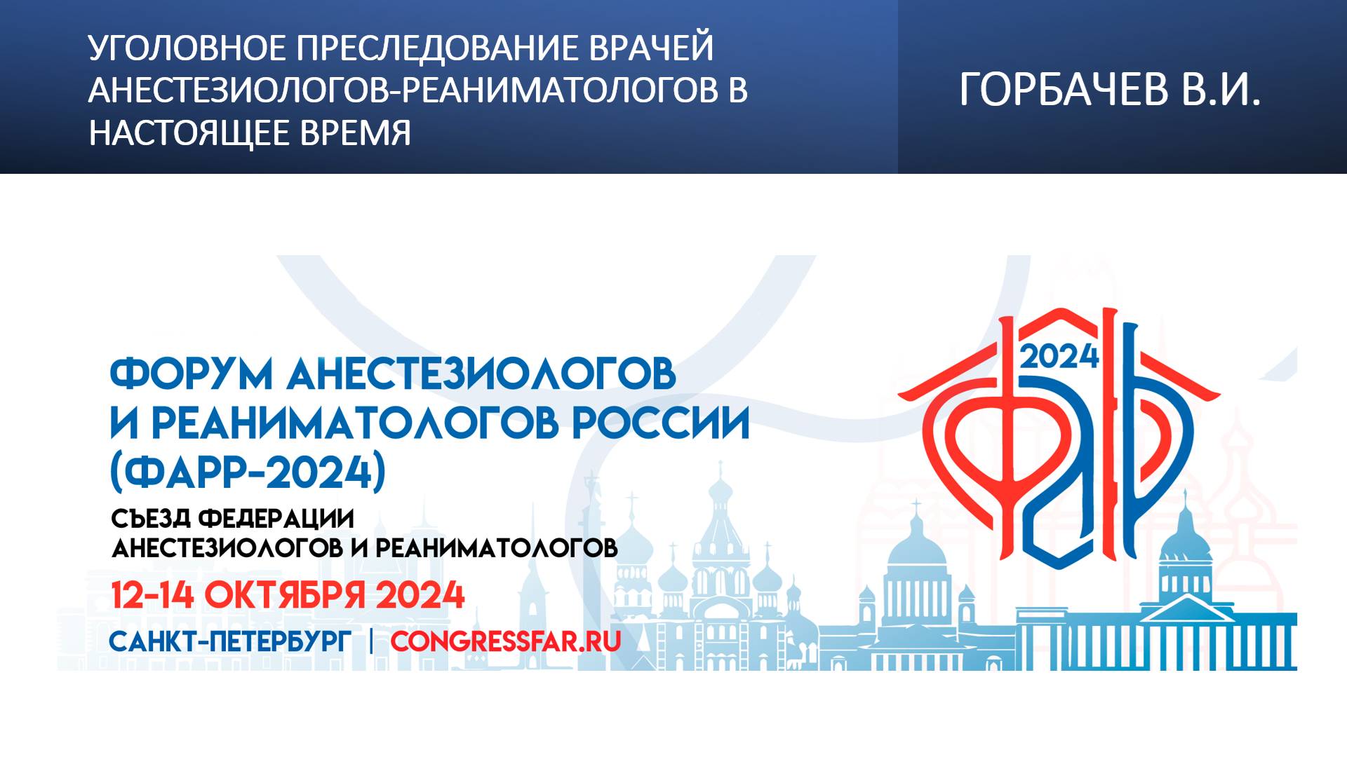 Видеозапись ФАРР-2024, XXII съезд Федерации анестезиологов и реаниматологов 12-14 октября 2024, Санкт-Петербург. Владимир Ильич Горбачев "Уголовное преследование врачей анестезиологов-реаниматологов в настоящее время" Информация, размещенная на канале, предназначена исключительно для медицинских специалистов