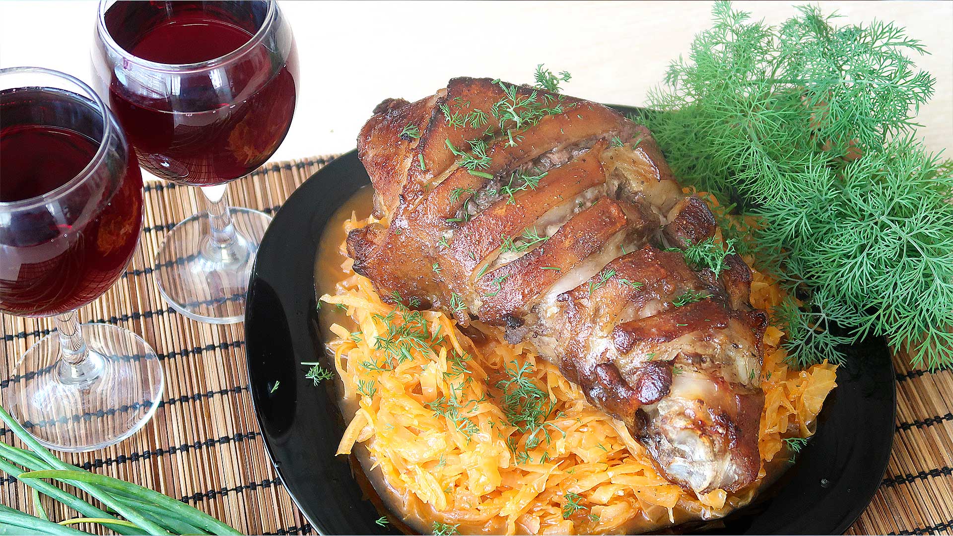 Свиная рулька запеченная в духовке с тушеной квашенной капустой