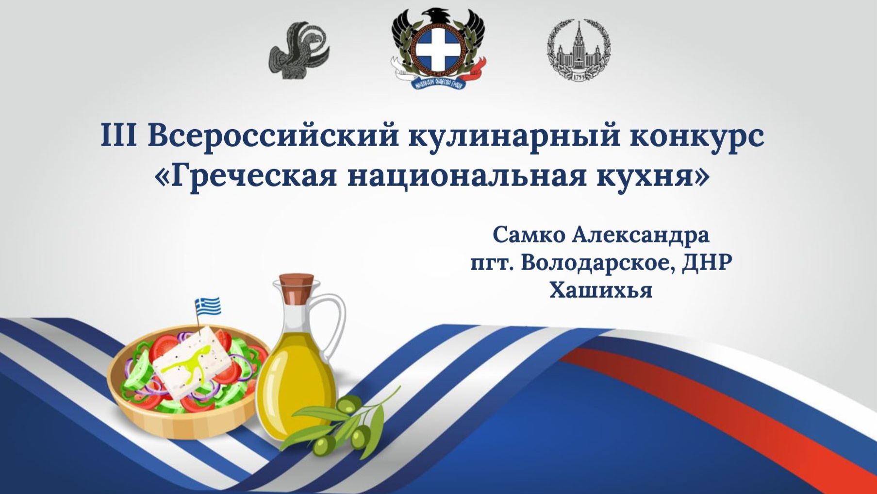 III Всероссийский кулинарный конкурс «Греческая национальная кухня» Организаторы Московское общество греков при поддержке Ассоциации неоэллинистов России и кафедры византийской и новогреческой филологии филологического факультета МГУ имени М.В. Ломоносова https://www.greekmos.ru/3-greek-national-cuisine/