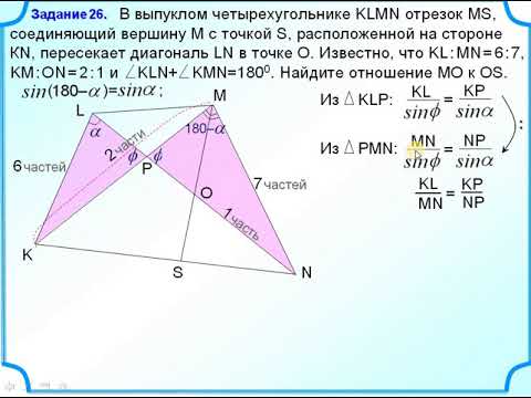 В выпуклом четырехугольнике KLMN отрезок MS, соединяющий вершину М с точкой S, расположенной на стороне КN, пересекает диагональ LN в точке О. Известно, что KL : MN = 6 : 7, KM : ON = 2 : 1 и сумма углов KLN и KMN равна 180⁰. Найдите отношение MO к OS.