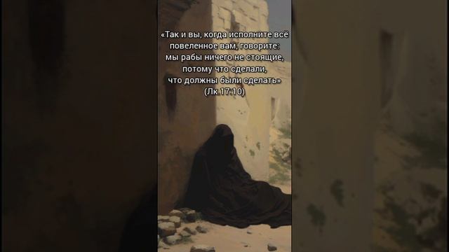 «Так и вы, когда исполните всё повеленное вам, говорите: мы рабы ничего не стоящие, потому что сделали, что должны были сделать» — цитата из Евангелия от Луки, глава 17, стих 10. Эти слова — часть притчи о работнике, пришедшем с поля. Согласно Святоотеческому учению, смысл притчи в том, что, сколько бы человек ни совершил дел благочестия, он не должен тщеславиться ими и думать, будто уже достаточно сделал для угождения Богу и своего спасения. У человека нет особых заслуг перед Богом, и на добрые дела нужно смотреть как на долг, а на себя — как на непотребных рабов. Святой Преподобный Исихий Иерусалимский: "Господь, желая показать, что всякая заповедь обязательна и что сыноположение есть дар, заслуженный людям собственно Его кровию, говорит: егда сотворите вся повеленная вам, глаголите: яко раби неключими есмы: яко, еже должни бехом сотворити, сотворихом (Лк. 17:10). Посему Царствие Небесное не есть награда за дела, а благостный дар Владыки, уготованный верным рабам. Раб не требует свободы, как награды; но (получив её) благодарит, как должник, а (не получив) ожидает, как милости."