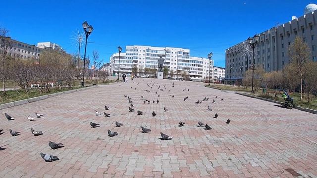 Лето в Магадане. Площадь Космонавтов начало июня 2020. Фонтаны и голуби.