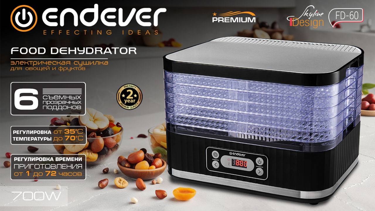 Представляем вам инновационную сушилку для овощей и фруктов Endever Skyline FD-60, которая станет незаменимым помощником на вашей кухне! Сушилка FD-60 обладает мощностью 700 Вт, что позволяет сушить продукты быстро и эффективно. Благодаря регулировке времени от 1 до 72 часов и температуры от 35 до 70 градусов, вы сможете получить идеально высушенные овощи и фрукты с сохранением всех полезных витаминов и минералов. В комплекте поставляется 6 прозрачных поддонов, которые позволяют контролировать процесс сушки. Прозрачные стенки дополнительно упрощают наблюдение за продуктами во время процесса. Также положение поддонов имеет 2 уровня: с маленьким зазором – для тонких овощей и фруктов и с большим зазором – для более толстых. Общий объем с большим расстоянием между поддонами составляет 12 л, а с маленьким – 6 л Электронное управление с LED дисплеем делает использование сушилки максимально удобным и понятным. А регулировка высоты поддонов позволяет сушить продукты различной толщины. Вам необязательно находиться рядом с устройством, так как по завершению работы предусмотрен звуковой сигнал. Наслаждайтесь свежими и вкусными овощами и фруктами круглый год с помощью нашей сушилки Endever Skyline FD-60! Благодаря системе с циркуляцией горячего воздуха вы сможете приготовить сушеные лакомства быстрее и без лишних хлопот. Попробуйте сами и оцените все преимущества этой удивительной техники! Подробнее https://www.endever.su/catalog/drying_of_vegetables_and_fruits/endever_skyline_fd_60/