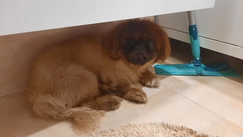Пекинес Дендик в такие жаркие времена, нашёл себе местечко где прохладнее. В ванной на плитке под раковиной. Жарко малышу.