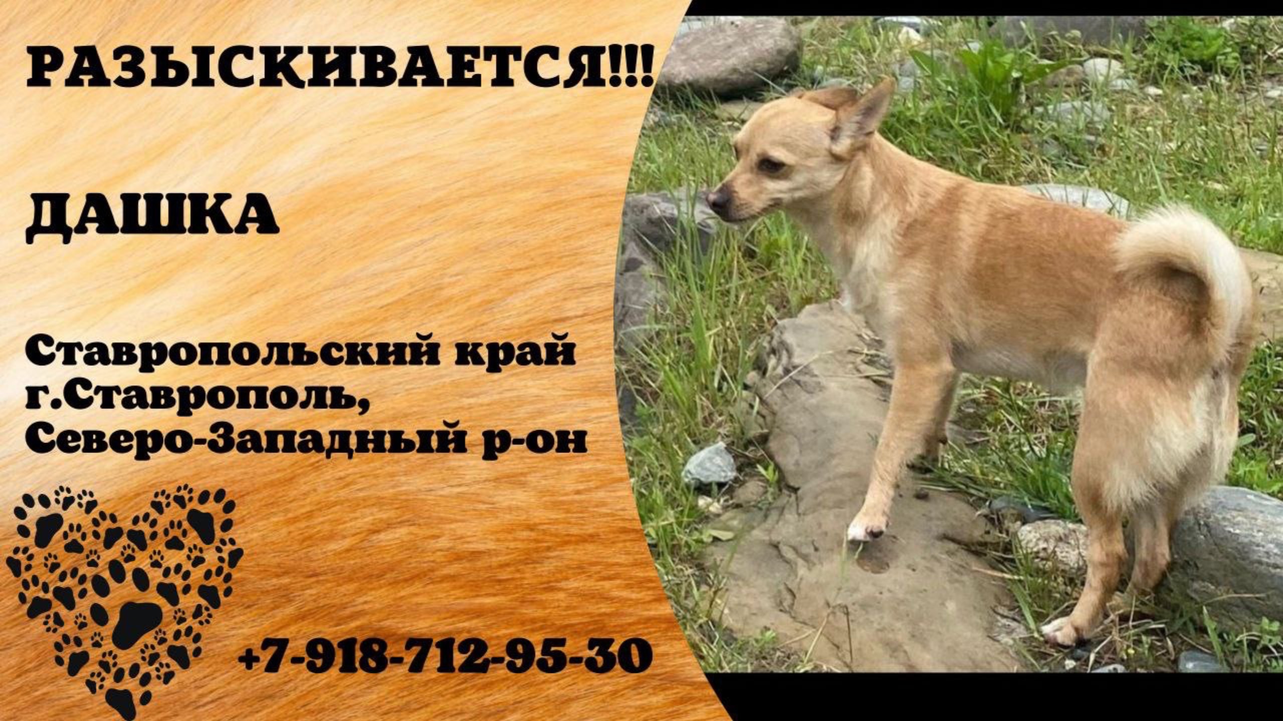 Ставропольский Ставрополь Пропала собака 28 декабря из шлейки вырвалась и убежала в Северо-Западном районе г. Ставрополя. Очень боязливая. От страха дезориентируется, могла убежать далеко. Девочка, рыжего цвета, грудь белого цвета, метис тойтерьера и шпица, небольшая - вес 4,5. Особые приметы: вертикальная полоска розового цвета на черном носике. Кличка - Дашка. Просим сообщить о месте нахождения или вернуть за вознаграждение. Контакты: 8-918-712-95-30 или 8-919-759-08-00 Инфо: https://vk.com/wall-198815410_169965 Автор: https://vk.com/id563472168 #пропала_собака#ставропольский#ставрополь