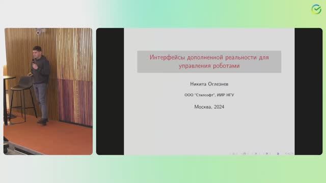 Спикер - Оглезнев Никита Доклад рассказан на робототехнической конференции ROS Russian Meetup Чат ROS сообщества https://t.me/rosrussia Доклад посвящен проекту, выполненному в рамках Большой математической мастерской 2024: разработка прототипа AR-интерфейса для управления полуавтономным мобильным роботом. Разработка удобного интерфейса для управления мобильным роботом представляет собой нетривиальную задачу: необходимо одновременно поддерживать эргономичность и функциональность с точки зрения пользователя, скрывая при этом избыточную сложность и детали реализации. Таким критериям отлично удовлетворяют интерфейсы компьютерных стратегий: с помощью клавиатуры и мышки игрок может управлять движением юнитов, не задумываясь о его низкоуровневой реализации. Идея проекта состояла в интеграции интерфейса компьютерной игры для управления роботизированной колесной платформой с помощью технологий дополненной реальности. В формате proof-of-concept нашей команде удалось реализовать прототип такого робота. В рамках доклада будет представлен рассказ о технических особенностях решения: 1) как интегрировать AR с видеоданными; 2) как обеспечить частичную автономность робота при взаимодействии пользователя с интерфейсом с помощью RL.2