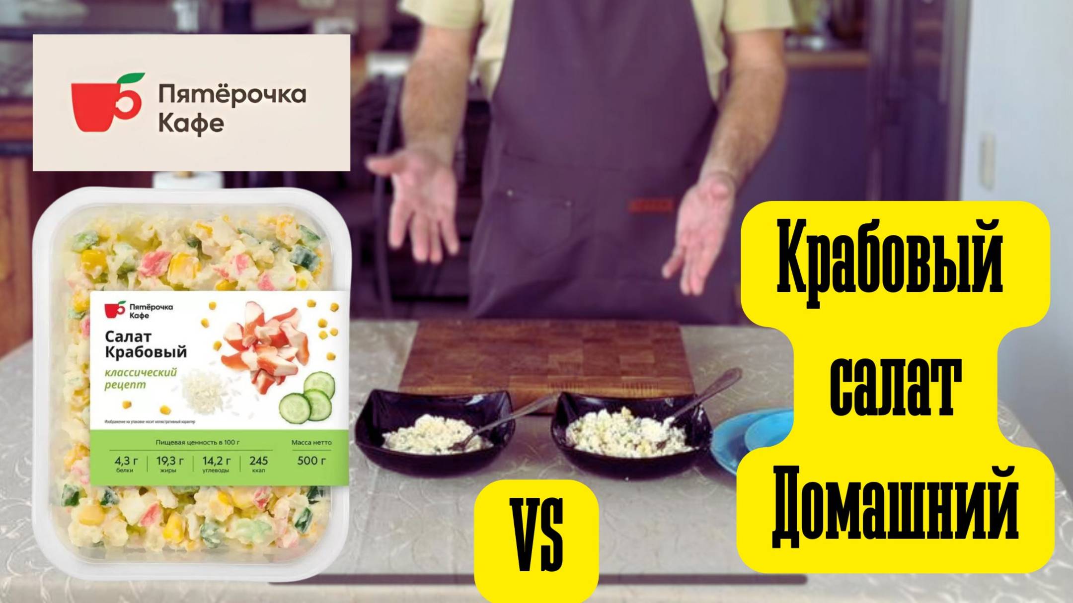 Салат из крабовых палочек с рисом и свежим огурцом. Проводим дегустацию домашнего салата и готового салата из Пятерочки. Сегодня мы приготовим салат с крабовыми палочками и сравним его с салатом из магазина Пятерочка. Мы взяли такие же ингредиенты , взвесили их , чтобы получился одинаковый вес. Вес 250 грамм. И сравним 2 этих салата между собой ради эксперимента. Ингредиенты на одну порцию: 1. Крабовое мясо 30 грамм. 2. Яйцо вареное 1 штука. 3. Огурец свежий 35 грамм. 4. Рис отварной 50 грамм. 5. Кукуруза 35 грамм. 6. Майонез 10-15 грамм. Способ приготовления : 1. Рис отвариваем. 2. Сварить яйцо вкрутую. 3. Крабовое мясо или палочки)измельчить. 4. Свежий огурец измельчить. 5. Все ингредиенты соединяем, добавляем майонез, смешиваем. На одну процию салата у нас получилось продуктов на 72 рубля. Салат из Пятерочки стоит 110 рублей! Салат получился свежий , вкусный, сытный. Готовьте с удовольствием! Всем приятного аппетита!