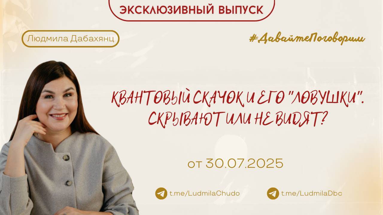 Рубрика #ДавайтеПоговорим Тема: Квантовый скачок и его "ловушки". Скрывают или не видят? Ценность выступления: На простом русском языке поговорим о том, что такое квантовый скачок. О том, для чего его так желают многие люди и не ведают действительности. Покажу на примере, как это выглядит: сделаем демоверсию квантового скачка, чтобы увидеть, что это такое. Расскажу, как предотвратить попадание в ловушки. 💫записи прошлых разборов здесь 👉🏻 https://rutube.ru/plst/364320 ‼️ ВАЖНО: Стартовало обучения работе с метафорическими картами с элементами вселенской терапии Л. Тальписа. Заходите в бот - https://t.me/ludmiladbc_bot и пишите "МАК" ИЛИ смотри мои курсы здесь https://ludmilachudo.skillspace.ru/school ‼️ канал #твАрец_реальности 2025 Подробнее: https://rutube.ru/video/2744940f7bab3063b818c926b2253dfc/ О канале: https://t.me/chatLudmilaChudo/4310 Заходите в бот - https://t.me/ludmiladbc_bot , если хотите участвовать Теперь в одном месте ты можешь посмотреть: ✔️ чем я могу быть для тебя и... ✔️ что я могу дать тебе Переходи: https://t.me/ludmiladbc_bot ✓ Обязательно поставь 💗 ✓ Подпишись на канал ✓ И поделись с близкими Это будет вашим балансом за движение и получение энергии. Если есть желание создать баланс брать-давать... приму от всего сердца с благословением (донейшн). С Огромной Любовью, Дабахянц Людмила 💓 ✨ Telegram: https://t.me/ludmiladbc ✨ Канал в telegram “Я ЕСТЬ”: https://t.me/LudmilaChudo ✨Онлайн-школа: https://ludmilachudo.skillspace.ru/school ✨Rutube: https://rutube.ru/channel/34371568/