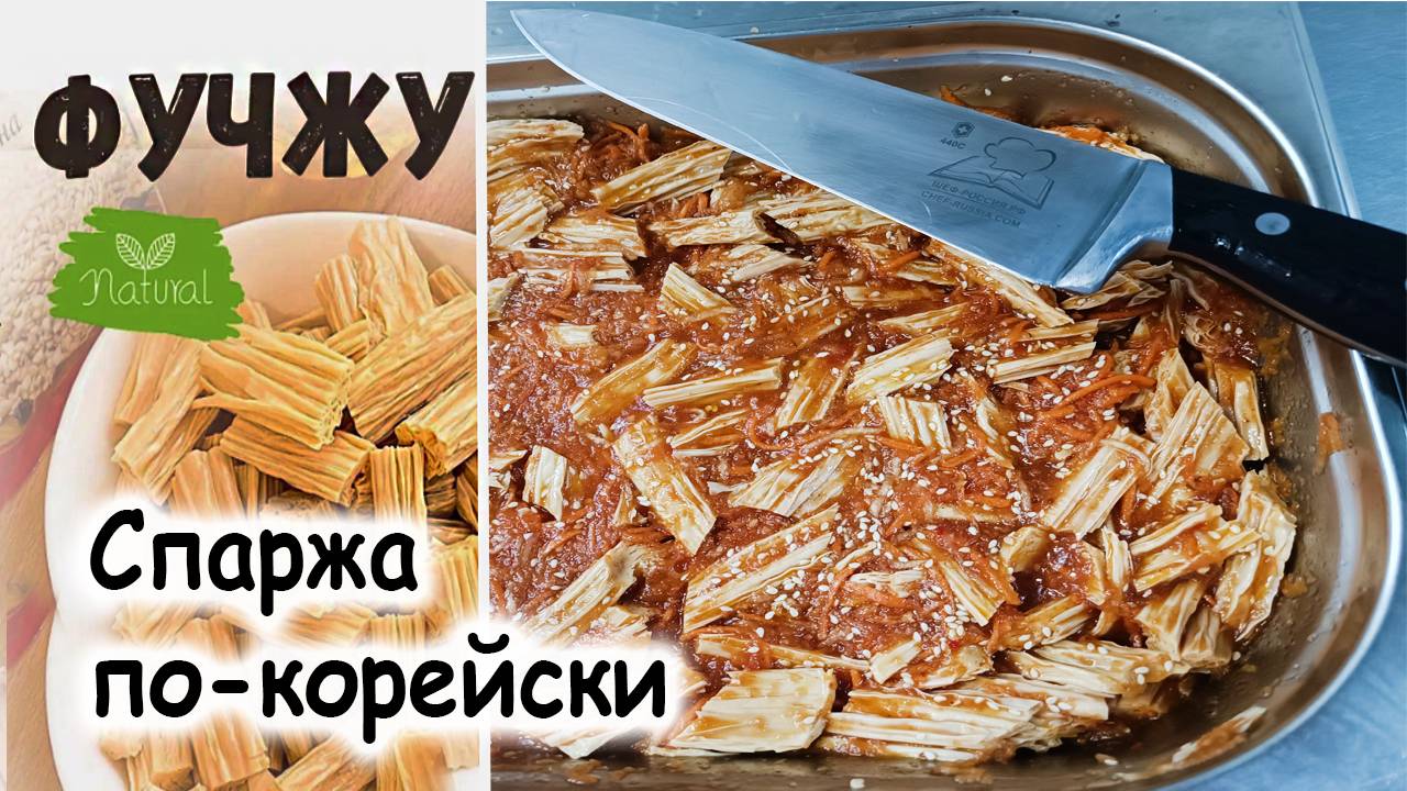 Шеф-Россия.рф скачать: книги, меню, ттк, рецепты, школа, мастер классы. Несколько рецептов с использованием сухой соевой спаржи: Спаржа по-корейски с луком: Ингредиенты: 200 г сушёной соевой спаржи, 1 морковь, 1 луковица, 3 зубчика чеснока, 70 мл оливкового масла, 1 ч. л. уксуса, специи. Приготовление: замочить спаржу в воде на ночь, промыть и нарезать порционно. Лук измельчить полукольцами, а морковь натереть на корейской тёрке и обжарить их до золотистости на масле. Выложить зажарку к спарже, перемешать и туда же добавить уксус, специи и давленый чеснок. Дать блюду настояться пару часов, а в идеале — оставить в холодильнике на ночь. Спаржа по-корейски с лимоном: Ингредиенты: 100 г сушёной соевой спаржи, 1 морковь, 2 зубчика чеснока, 1 лимон, 2 ст. л. сахара, по 1 ч. л. соли, кориандра и паприки, 3 ст. л. растительного масла. Приготовление: измельчить спаржу кусочками, залить водой и оставить набухать на ночь. Слегка отжать её и промыть, добавить тёртую на корейской тёрке морковь и немного лимонной цедры. Лимонный сок смешать с маслом, сахаром, солью, давленым чесноком и специями. Залить спаржу маринадом и оставить доходить минимум на час, а лучше — дольше. Плов с соевой спаржей: Ингредиенты: 50 г сухой соевой спаржи, 1 морковь, 1 луковица, 2–3 ст. л. растительного масла, ½ ч. л. карри, ½ ч. л. куркумы, 230 г белого риса, соль — по вкусу, 1 пучок петрушки или кинзы. Приготовление: размочить спаржу и разделить ножом на небольшие кусочки. Натереть морковь на мелкой тёрке и мелко нарезать лук. Обжарить овощи на разогретом масле до мягкости и золотистого цвета и переложить на тарелку. Разогреть в сковороде масло, всыпать карри и куркуму и дождаться, пока раскроется аромат специй. Выложить спаржу и обжаривать, помешивая, 5–7 минут. Отдельно отварить рис. За 7–10 минут до окончания варки выложить к нему овощную зажарку, спаржу и соль и перемешать. В готовый плов добавить рубленую петрушку или кинзу. Сухая спаржа (соевая спаржа, фучжу) не является продуктом, который выращивают на грядке. Это высушенная плёнка, снятая с соевого молока, ингредиент восточноазиатской кухни. К настоящей спарже продукт не имеет отношения. Существует легенда о происхождении фучжу: В средневековом Китае кто-то при варке сыра тофу обратил внимание на плёнку, которая образуется на поверхности соевого молока при нагревании. Он аккуратно снял её и высушил — так появилась первая фучжу. Знаменитой фучжу стала в период правления династии Тан. В золотой век Китая из неё делали продукты, имитирующие вкус мяса, чтобы порадовать буддистов. Со временем фучжу стала присутствовать в блюдах японской кухни, её полюбили в Корее, Монголии и в других странах. Технология производства Процесс приготовления фучжу: Бобы сои вымачивают, а затем измельчают. Из протёртой массы получают соевое молоко. Молоко кипятят, на его поверхности образуется фупи — плотная плёнка. На завершающем этапе приготовления плёнку аккуратно снимают с молока и подвешивают для высыхания. Пенка становится сморщенной и вытянутой, её высушивают в горизонтальном положении. Применение В кулинарии фучжу используют как ингредиент для разных блюд. Например: Свежие листы нарезают тонкими полосками и добавляют в салаты или супы. В жареном виде спаржу также добавляют в супы и другие горячие блюда. Большие неразрезанные листы используют как обёртку для п