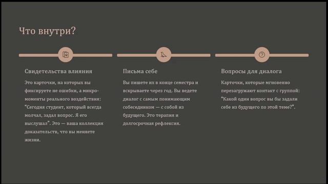 Личность в СПО: педагог как навигатор и вдохновитель • Автор: Нинкин Кирилл Юрьевич • Рубрика: Психология в образовании / Саморефлексия / Эмоциональный интеллект педагога / Профилактика выгорания • О чем видео: Автор поднимает тему внутреннего состояния преподавателя, его усталости, потери смысла и ощущения себя «частью большой системы». Вместо сложных теорий спикер предлагает простой и действенный инструмент — «капсулу времени педагога». Это не волшебная таблетка, а личный помощник, который помогает замечать и сохранять хорошие моменты, возвращать себе авторство своей профессиональной жизни и через это — снова чувствовать интерес к преподаванию и передавать его студентам. • Ключевые моменты: 1. Проблема: Преподаватели часто сталкиваются с состоянием опустошенности, когда день превращается в «галочки», а собственная роль стирается. Без внутреннего ресурса невозможно вести за собой студентов. 2. Что такое «Капсула времени педагога»: Это личный дневник-помощник, состоящий из трех простых инструментов, который фиксирует хорошее, помогает остановиться и напоминает, что работа педагога — это «сажать семена», а не работать на конвейере. 3. Три инструмента капсулы: o Карточки-свидетели: Для быстрой записи маленьких, но хороших деталей дня (удачная шутка на паре, успех студента). o Письма себе: Конверты, которые подписываются и открываются через год (например, в конце семестра), чтобы позже стать «мостиком» к себе прошлому. o Вопросы-помощники: Готовые фразы, чтобы оживить разговор с группой и увидеть практическую ценность предмета (например: «Если бы эта тема была инструментом, для чего бы она пригодилась в жизни?»). 4. Техника «Три шага» при ощущении бессмысленности: o Шаг 1: Взять в руку любой предмет из капсулы (камень), чтобы остановиться и успокоиться. o Шаг 2: Записать на чистую карточку один хороший момент за неделю. o Шаг 3: Положить карточку обратно, сохранив этот момент. 5. Результат: Инструмент меняет точку зрения: педагог перестает быть просто «исполнителем» и начинает замечать себя как «автора» своей профессиональной истории, видеть не только проблемы, но и маленькие победы. 6. Демонстрация: Автор показывает метод на себе, фиксируя свое волнение перед выступлением как осознанное действие, а не просто эмоцию. • Для кого: Для педагогов, преподавателей, кураторов и всех работников образования, кто чувствует профессиональную усталость, хочет предотвратить эмоциональное выгорание или ищет простые способы восстановить контакт с собой и смыслом своей работы. Сайт- https://kip.fa.ru ВК - https://vk.com/kip_college