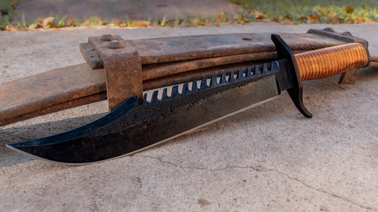 Хотя ни один нож не способен выдержать эти испытания, следует сказать, что он показал себя очень хорошо, особенно высокая твердость кончика... Я был удивлен, что он не сломался после многих ударов по другому металлу. Нож выполнен в стиле «Рэмбо», и я решил сохранить рустикальную поверхность стали, как обычно делаю в других работах. Край правильный после тестирования. Я вполне доволен результатом Надеюсь, этот нож вам понравился так же, как и мне! Технические характеристики: Совет: точка отсечения Сталь: 5160 Общая длина: 40 см. Длина лезвия: 27,5 см. Длина ручки: 12,5 Толщина: 7 мм Вес: 618 г Материал ручки: Кожа. -------------------------------------- Используемые инструменты: Болгарка с отрезным диском Шлифовальный станок Файлы Наждачная бумага с зернистостью: 120 и 220. Скамейка тиски Эпоксидная смола Дрель со сверлами Кузнечная печь с двойной горелкой Контейнер для закалки -------------------------------------- #ИзготовлениеНожей #КузнечноеИскусство #РеставрацияМеталла #КовкаНожей #СамодельныеНожи #КованыйКлинок #Металлообработка #ТворческаяКовка #нож #ножи