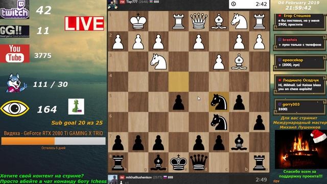 Multistreaming with https://restream.io/ Комментирует международный мастер Михаил Лушенков. Если хотите меня поддержать ставьте лайки! А так же подписывайтесь на мои каналы: goo.gl/ZoFAEG https://goodgame.ru/channel/ganniklive/ https://www.twitch.tv/gannikchess Теперь вы можете поддержать стримера на Ютубе приобретя платную подписку за 249 рублей в месяц. Просто нажмите на значок $ внизу экрана. DonationAlerts (Карты,QIWI,ЯДеньги,Сбербанк,Телефон,WebMoney) (озвучка ботом русского текста сообщений от 100 рублей) : http://www.donationalerts.ru/r/gannik2016 TwitchAlerts (PayPal, Карты, Yandex, QIWI, WebMoney и т.д.) (озвучка ботом от 100 RUB) : https://streamlabs.com/gannikchess http://donatepay.ru/d/108789 Поддержка через плеер GoodGame.ru комиссия гудгейма 10 % (с левой стороны плеера). Минимальная сумма для озвучивания сообщения на стриме при донате через GoodGame.ru 100 рублей! Дискорд - https://discord.gg/cD92CWQ Группа вконтакте - https://vk.com/club51469705 для анонсов По вопросам обучения пишите на почту - lushenkov-chess@mail.ru Поддержка стримов Шахматы. Mikhail-Chess. Спасибо всем неравнодушным! Благодаря вашей поддержки нам удалось улучшить качество трансляций! Вы можете заказать свою тему на стриме! Просьба указывать детали заказа. Игрок Разыграть дебют (кроме одного варианта, он ниже) - 150 рублей. (здесь и далее за 1 партию) Разыграть дебют Эльшада любым цветом - 500 рублей Сыграть против стримера - 200 рублей Сыграть вслепую - 500 рублей Пожертвовать материал по ценности фигур (пешка=100, слон = 300 и т.д.) Выиграть(!) любым цветом любым дебютом - 500 рублей (игра до победы но не более 5 партий) Выиграть(!) с форой у донатера по ценности фигур умноженным на 2 (стример с донатером играют до победы стримера но не более 5 игр). Сыграть в шахматы на четверых 2000р за 1 игру Сыграть с форой по времени ( у стримера 1 минута у донатера до 10, например 1 против 6 = 500 рублей) Выиграть(!) с форой по времени ( у стримера 1 минута у донатера до 10 = в 2 раза дороже, например 1 против 6 = 1000 рублей) Играем до победы стримера но не более 5 партий. Сыграть в вашем турнире = 2000 рублей (1 час) Комментатор и организитор Разбор вашей (моей) партии - 150 рублей за игру(здесь и далее) Тщательно комментировать свою партию во время игры - 150 рублей Создать турнир - 1000 рублей (1 час) Создать сеанс - 150 рублей с человека Скипнуть (отменить) играемый вид шахмат и заказать свой (вне заказов зрителей) 2000 час. Выполнить ваш челлендж - цена договорная в зависимости от сложности. Передать привет или ответить на вопрос вне очереди - 100 рублей. Остальное выполняется по запросу. Готов обсудить другие ваши заказы контента на стрим. Желательно все перечисленное что бы выполнялось не во время важных турниров (призовых). Но если вы настаиваете то заказ будет выполнен. Если нет возможности выполнить в один стрим - все переносится на следующий, по просьбе заказчика. З.Ы. Премиум на Гудгейме(299 р месяц) приравнивается к 300 р. Sub на Twitche приравнивается к 300р.