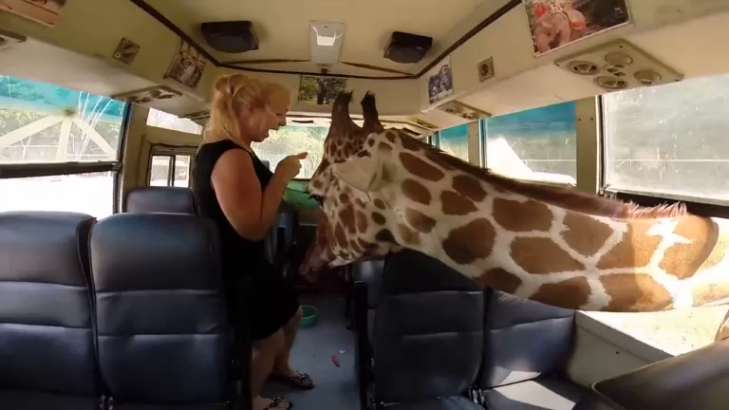 Жирафы пытаются заглянуть в автобус