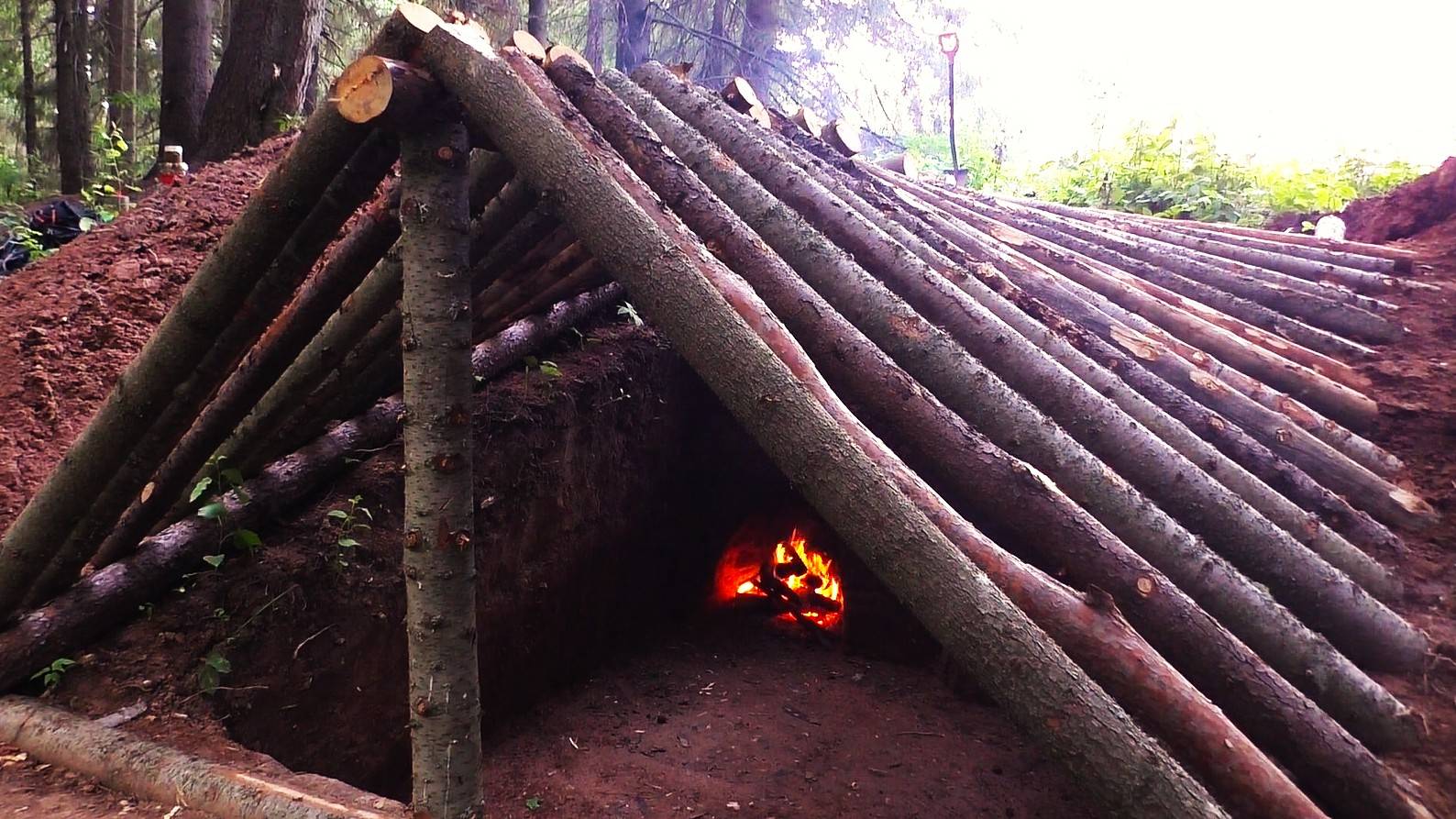 Строю ЗЕМЛЯНКУ в ТАЙГЕ возле ручья! Часть 2. Собрал каркас, 1 слой крыши и обустроил очаг. №148