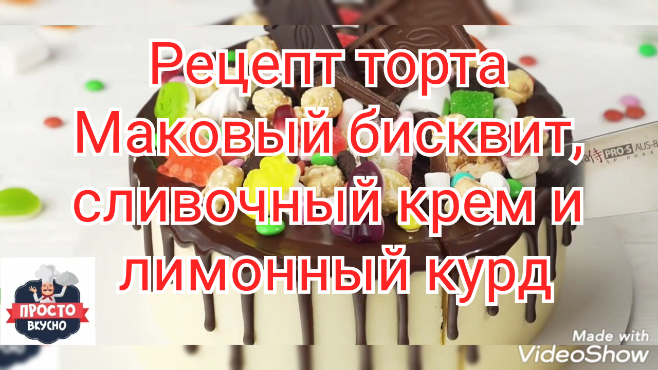 Подпишитесь на канал! И поставьте лайк ?, мне будет приятно ?, оставляйте Ваши комментарии мне очень интересно Ваше мнение ? ИНГРЕДИЕНТЫ: Бисквит: яйца - 6 шт. сахар - 120 г (6 ст. л.) мука - 120 г (6 ст. л.) масло сливочное - 100 г мак - 100 г соль - 1 щепотка Лимонный курд: лимон - 1,5 шт. яйца - 2 шт. сахар - 110 г масло сливочное - 70 г крахмал - 5 г Сливочный крем: сливки (не менее 30% жирности) - 300 мл творог - 200 г сахар - 180 г (100 г + 80 г) сливки (сметана) - 30 мл ванильный сахар - 10 г желатин - 15 г вода - 60 мл Сироп для пропитки: сахар - 1/2 стакана вода - 1/2 стакана Крем чиз для украшения торта: сыр сливочный - 450 г масло сливочное - 150 г сахарная пудра - 120 г Глазурь: шоколад черный - 100 г сливки 10% - 40-70 мл Украшение: шоколад черный мармелад печенье Орео мини желейные конфеты жевательный зефир попкорн в карамели шоколадка Сникерс конфеты М&М`s Music: www.bensound.com Royaty Free Music: https://www.bensound.com License code: R8B3Q6F46SWLKTTS