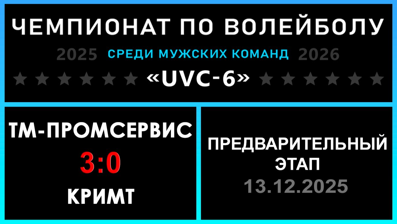 UVC-6 (Мужчины): Чемпионат UVC Лиги по волейболу среди мужских команд 2025-2026 гг. Результаты игры: Предварительный этап 13.12.2025 Тм-Промсервис - КрИМТ 3:0 (25:16, 25:8, 25:23) Тм-Промсервис буксовал в третей партии, но своего не упустил! КрИМТ завершил Предварительный этап, команда отправляется в Групповой этап LEVEL ONE! «РЕШАЛЫ» - конкурс для команд : ✅ Тм-Промсервис идет дальше! «Nostradamus trophy» - конкурс для участников группы ВКонтакте: ✅ 62 - количество участников, которые смогли предсказать точный исход матча! #UVC_ЛИГА_ЧЕМПИОНАТ_UVC_6_Мужчины