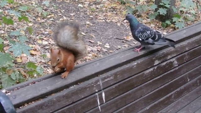 Голубь хотел отжать орешки у Ушастика, но Ушастик не дрогнул