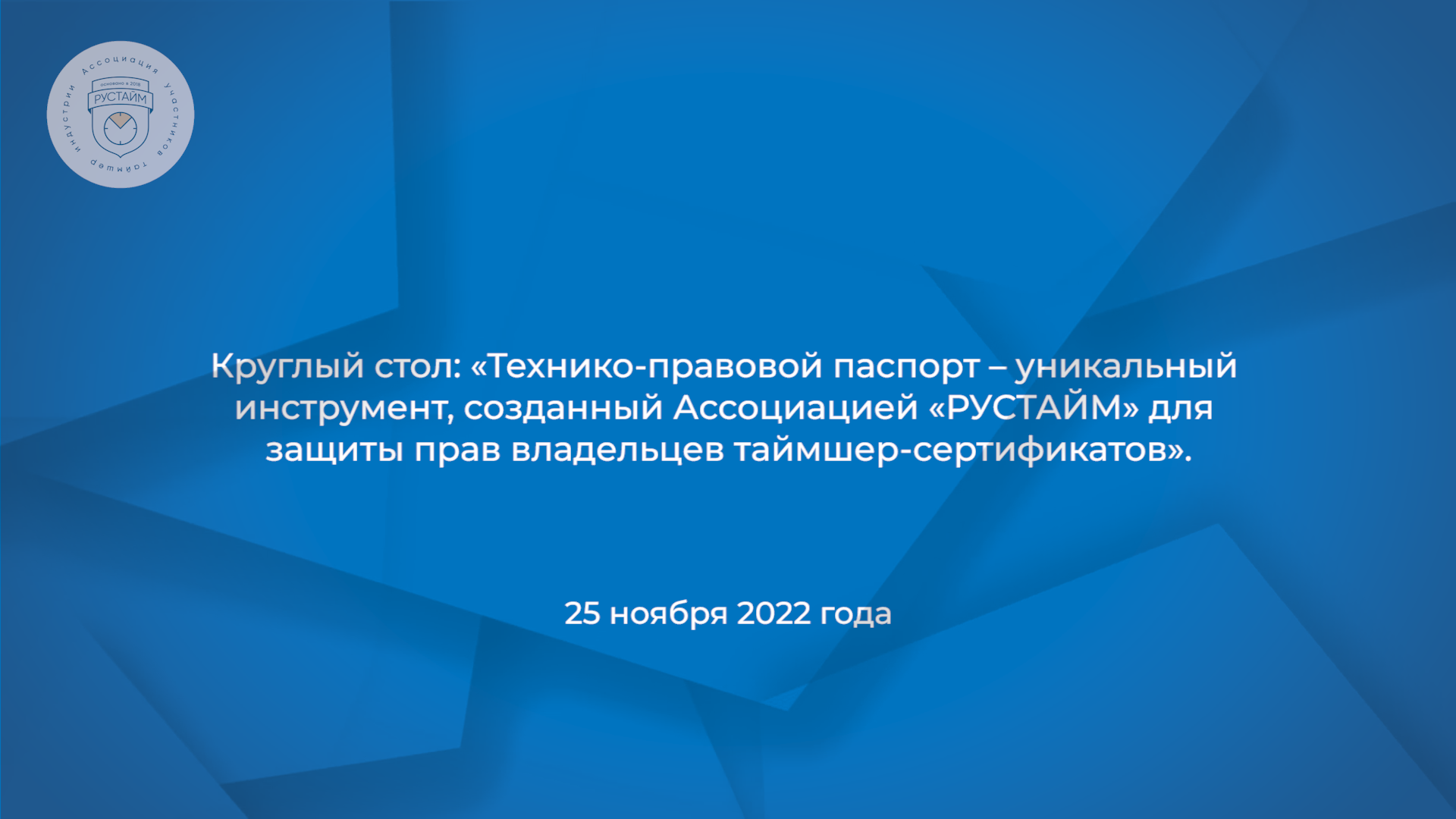 25 ноября 2022 года Ассоциация «Рустайм», презентовала свой инновационный продукт – технико-правовой паспорт таймшер и единый реестр сертификатов с полностью подтверждённым правом владения. Круглый стол состоялся в Зале заседаний Комитета по международным делам Государственной Думы Федерального Собрания Российской Федерации. В дискуссии принимали участие эксперты «Рустайм», лидеры профессионального сообщества, общественные деятели, представители органов законодательной и исполнительной власти. В обсуждении приняли участие: Наталья Сергеевна Кочеткова, заместитель директора Департамента государственной политики в сфере воспитания , дополнительного образования и детского отдыха, Андрей Григорьевич Замятин, директор Института развития туризма и курортного дела , Илья Викторович Дубровский, главный редактор журнала «Турист», Алла Леонидовна Салаева, член комитета по туризму и развитию туристической инфраструктуры ( депутат Государственной Думы), Юрий Валентинович Коротков, генерал майор МВД , Валерий Рудольфович Хилтунен, вице-президент Евразийской академии телевидения и радио , Олег Тимофеевич Безродный, президент «РУСТАЙМ». В ходе дискуссии участники Круглого стола отметили, что Технико-правовой паспорт таймшер – уникальный документ, являющийся революционным решением для таймшер-владельцев в России и других странах. Создание единой базы данных и проведение официальной экспертизы таймшер-сертификатов, по мнению всех участиков Круглого стола, способно пресечь существование «дикого рынка» таймшер не только в России, но и на территории большинства стран СНГ.